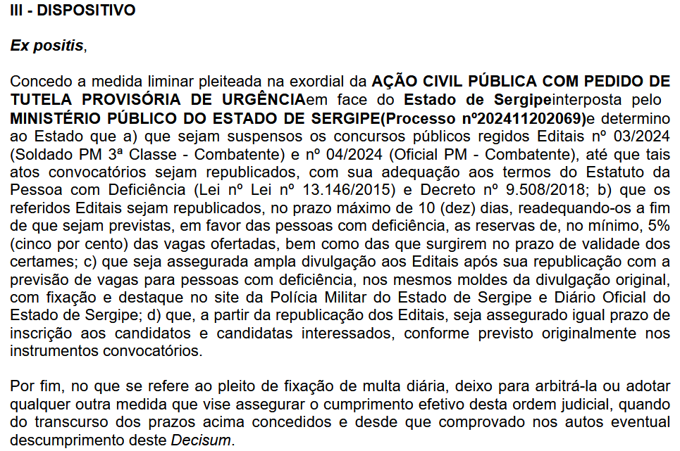 - Os editais nº 03/2024 (Soldado PM 3ª Classe – Combatente) e nº 04/2024 (Oficial PM – Combatente) sejam republicados no prazo de 10 dias, com a inclusão das vagas reservadas para PcD.