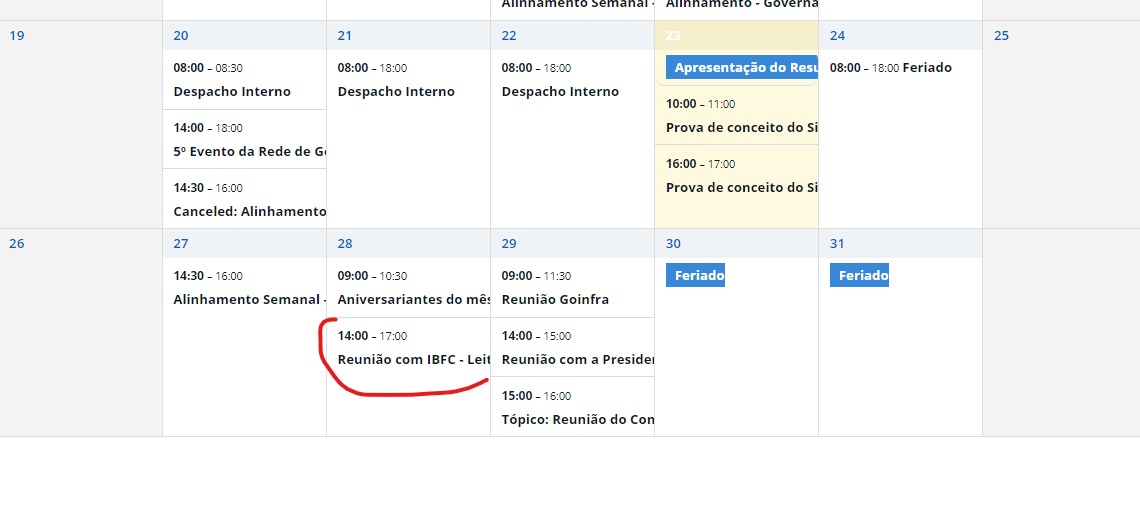 A chefe da Superintendência de Recrutamento e Seleção da Secretaria de Administração de Goiás, Ana Paula Braga Ferreira Coan, terá um encontro com o IBFC para ler o edital do concurso PPGO. O encontro, marcado na agenda, será em 28 de maio no período da tarde. A expectativa é que o edital seja publicado na próxima semana. Confira: