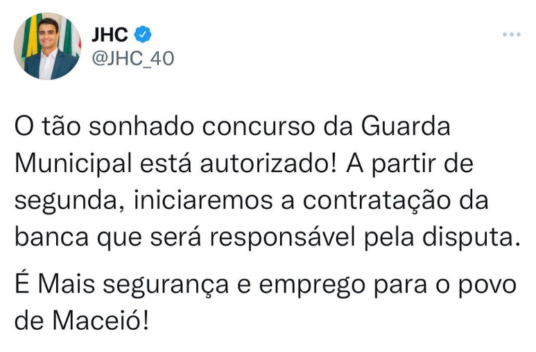 A autorização foi anunciada por meio das redes sociais de João Henrique Caldas, prefeito de Maceió. Além disso, João Henrique ressaltou que a banca organizadora também está em processo de contratação. Veja: